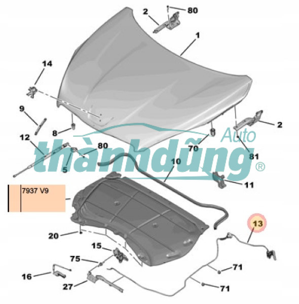 DÂY GIẬT NẮP CAPO PEUGEOT 508 2013 | 7937V9 hay còn gọi là Dây giật nắp capo, Cáp mở nắp capo, Cáp giật nắp capo. Đây là một bộ phận cơ khí nhỏ bé nhưng đóng vai trò cực kỳ quan trọng. Nó là một sợi cáp dài, linh hoạt được bọc dưới một lớp vỏ bảo vệ. Một đầu gắn với cần kéo trong khoang lái. Một đầu gắn vào chốt khóa nắp capo. Dây giật nắp capo giúp bạn dễ dàng “bật mở” nắp capo và thực hiện công việc dưới khoang máy. Cáp mở nắp capo một phần không thể thiếu của mọi chiếc xe.